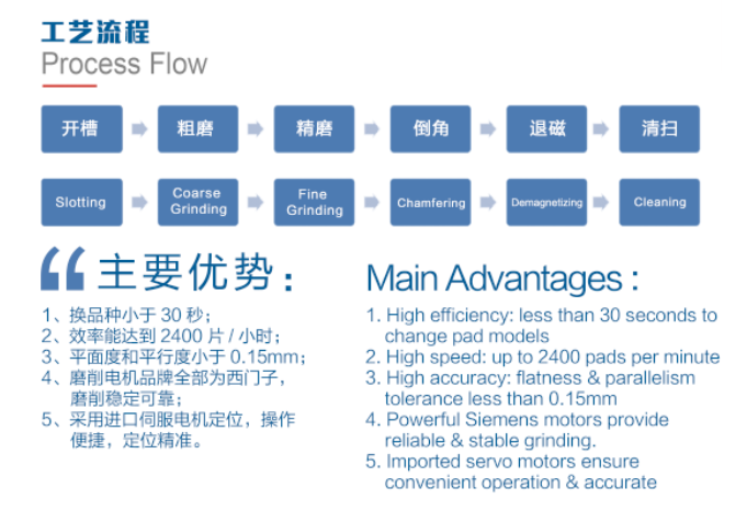 刹车片全自动数控直线磨床是用来完成刹车片的开槽、倒角和磨平的产品。该产品通过输入刹车片的外形参数即可快速完成刹车片的磨制。该产品在开槽方面能开直槽和斜槽,在磨平方面分粗磨和精磨两种。使用方便,操作简单